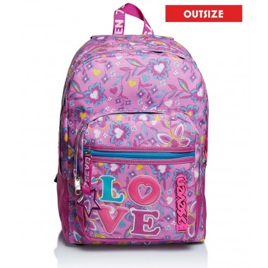 Doppio scomparto. Inserti rifrangenti per una protezione a 360°. Applicazione "Love" imbottita. Con moschettone amovibile. Lo schienale Ergosystem preformato con fondo...