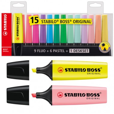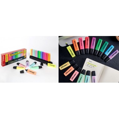 Pratico set da scrivania con 15 evidenziatori: 9 colori fluorescenti e 6 pastello