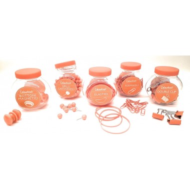 Elastici colorati in gomma da 30 grammi in barattolo da scrivania con rientranza laterale per appoggio inclinato.