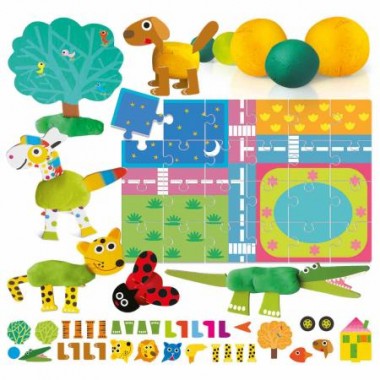 Contenuto: 1 puzzle della città 45 x 30 cm di 24 pezzi 2 vasetti di plastilina 20 animali sagomati 12 elementi scenografici.