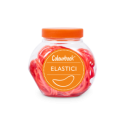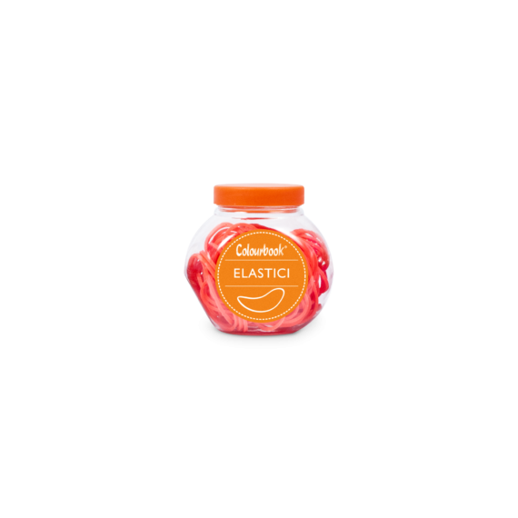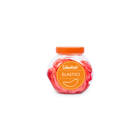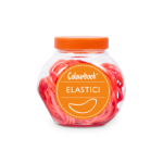 Elastici colorati in gomma da 30 grammi in barattolo da scrivania con rientranza laterale per appoggio inclinato.