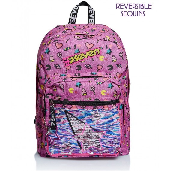 Doppio scomparto. Applicazione con paillettes reversibili. Inserti rifrangenti per una protezione a 360°. Logo e patch in vernice glitter. Con moschettone amovibile. Lo schienale Ergosystem preformato con fondo integrato e gli spallacci imbottiti e traspiranti lo rendono leggero e confortevole da indossare anche quando è davvero pieno, proteggendoti la schiena.