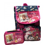 SCHOOLPACK composto da : Zaino estensibile con zip laterale, tasca frontale con chiusura a zip, schienale e spallacci imbottiti+ ASTUCCIO 3 zip coordinato ( CONTENUTO: 1 penna a sfera cancellabile blu, 1 penna rossa, 18 pastelli, 18 pennarelli, 1 colla, 1 matita, 1 gomma, 1 temperino,1 righello trasparente, 1 goniometro trasparente, 1 forbice)